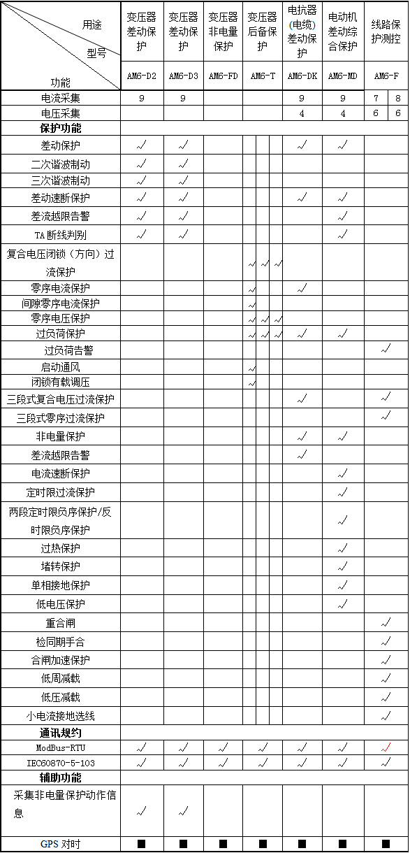 | AM6-D2 變壓器差動保護裝置(二繞組) | 110kV及以下電壓等級容量為6300kVA及以上的變壓器 |