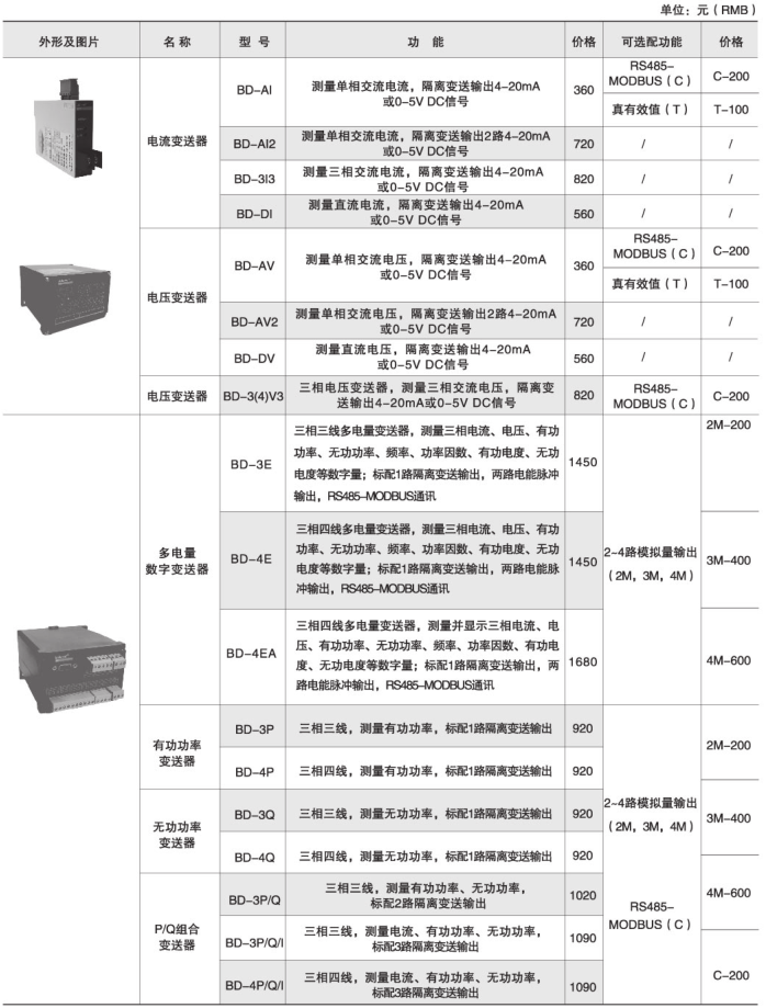| 電壓變送器 | BD-AV | 測量單相交流電壓,隔離變送輸出4-20mA或0-5V DC信號 | RS485-MODBUS |
