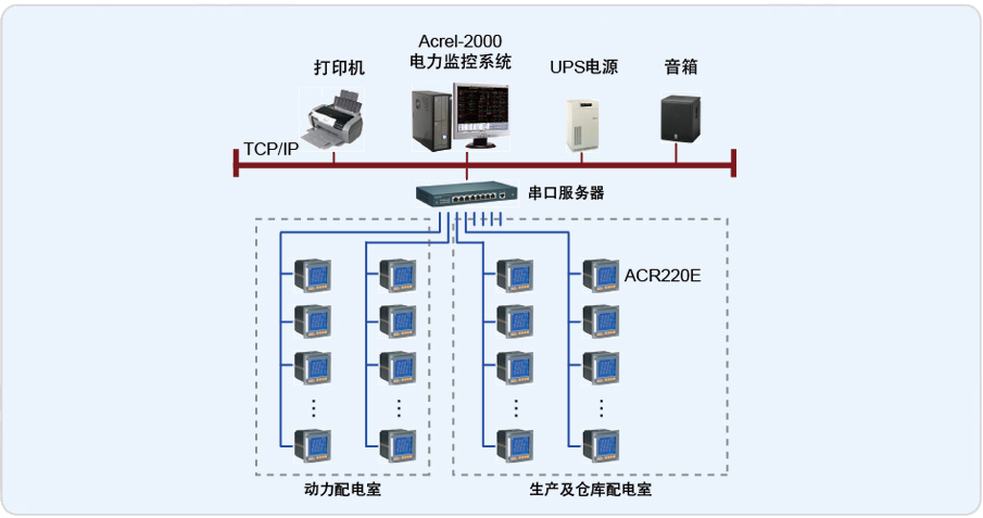 安科瑞電氣股份有限公司于2013年3月承接了杭州賽諾菲民生健康藥電力監控系統項目。整個系統采用Acrel-2000型電力監控系統,完成了杭州賽諾菲民生健康藥業有限公司共有2個配電室(動力中心配電室、生產廠房及倉庫配電室)電力監控。動力中心配電室內有2臺進線柜、1臺母聯柜、4臺補償柜及24路普通饋線回路;生產及倉庫配電室內有2臺進線柜、1臺母聯柜、4臺補償柜及43路普通饋線回路,整個監控范圍為81個回路的電參量監測,每個回路均采用安科瑞ACR220E型多功能儀表。網絡儀表均采用RS485接口和MODBUS-RTU通訊協議,RS485采用屏蔽線傳輸,上傳至監控主機。