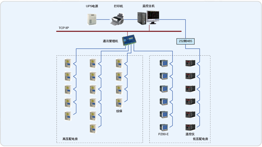 該項目是一個新建廠區的配電系統,包含35KV變壓器2臺,10KV變壓器3 臺,項目中監控范圍為35KV線路微機保護裝置2臺,變壓器溫控儀8臺,10KV微機保護裝置12臺,安科瑞智能儀表8臺,本套系統主要強調實時數據的監測、控制,主要針對整個配電系統可靠性進行全程的智能化監控,數據分析,投、斷,以及對各回路所用電能進行統計。
