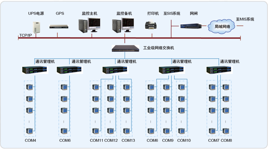為了能實現對電廠電能量數據進行自動采集、遠傳和存儲、預處理、線損統計及分析的電能綜合管理平臺,合肥電廠電能量管理系統采用了Acrel-3000電能管理軟件,通過現場總線把現場的電能儀表進行集中管理,做到了自動采集、集中控制、智能管理。同時本電能管理系統還具備同廠內SIS(監控信息系統)以及MIS(管理信息系統)共享。