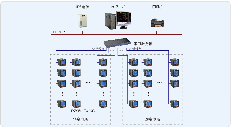 本項目現場2個配電室,即1#變電所和2#變電所,監控值班室位于1#變電所,2#變電所與1#變電所之間相距大約500米。共180塊PZ96L-E4/KC網絡電力儀表。通過組態軟件Acrel-2000實現對現場儀表的實時監測,并記錄歷史數據自動生成報表,以便查詢。