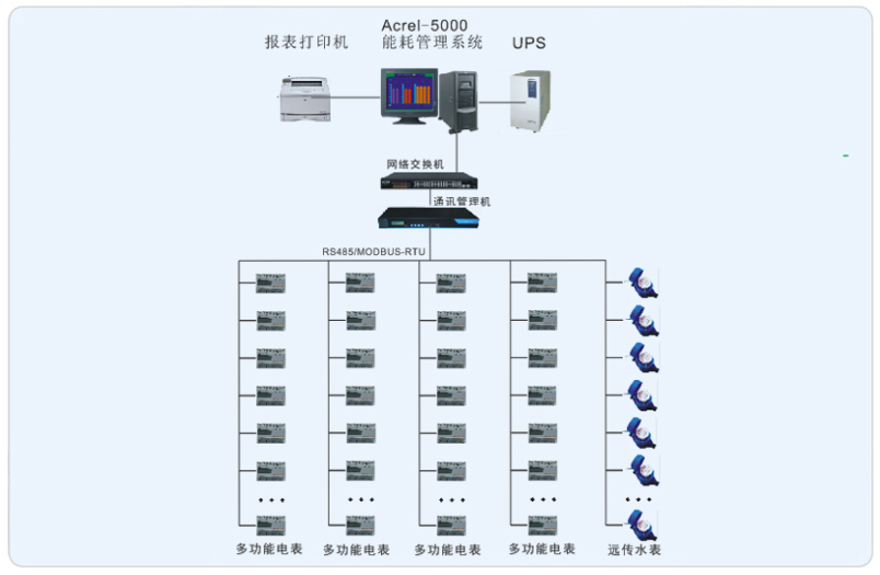 系統(tǒng)采用Acrel-5000型能耗檢測系統(tǒng),整個(gè)系統(tǒng)采用網(wǎng)絡(luò)分布式結(jié)構(gòu),監(jiān)控主機(jī)位于旋極科技大廈一樓機(jī)房內(nèi),現(xiàn)場電表在每個(gè)樓層的南北區(qū)內(nèi)。水表分布在每層的男女廁所的豎井里。所有配電回路均配備安科瑞電力儀表DTSY系列及積成光電直讀系列水表。該項(xiàng)目實(shí)現(xiàn)了旋極科技大廈主辦公樓的能耗檢測。所有監(jiān)控設(shè)備均通過屏蔽雙絞線至一樓的通訊管理機(jī)再通過網(wǎng)線連接到主機(jī)從而實(shí)現(xiàn)遠(yuǎn)程監(jiān)控。