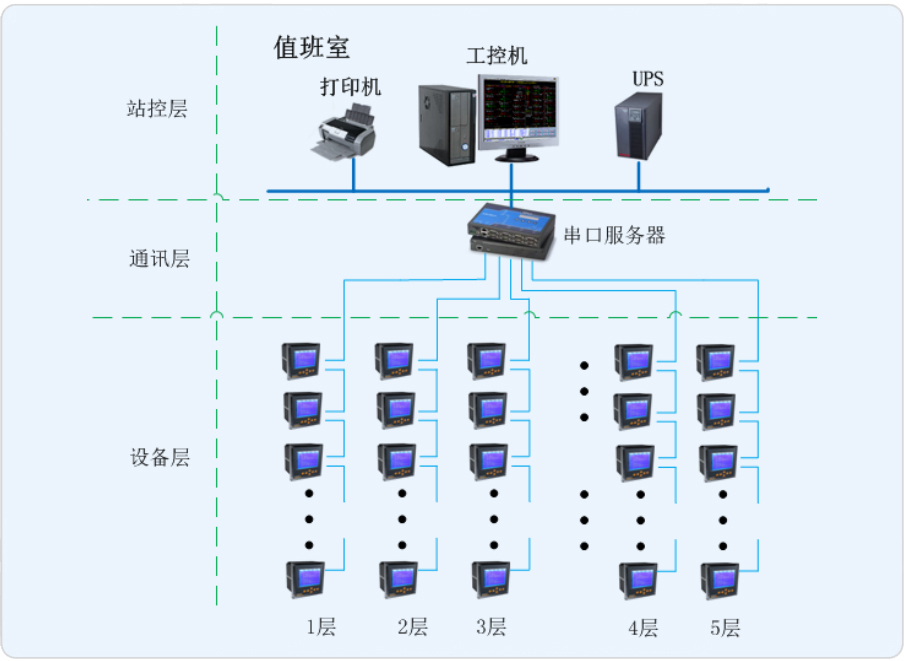 本項目是為羅店鎮市民服務中心樓層配電部分設計的電能管理系統,監控范圍為8層樓內的多功能儀表。現場多功能儀表通過總線接入值班室采集器,再將通過采集器連接到監控主機,從而在監控主機上實現總線上儀表與監控主機的數據連通。通過Acrel-3000電能管理系統對樓層用電環節進行記錄與統計,借助計算機輔助手段進行集抄,節省人工成本。