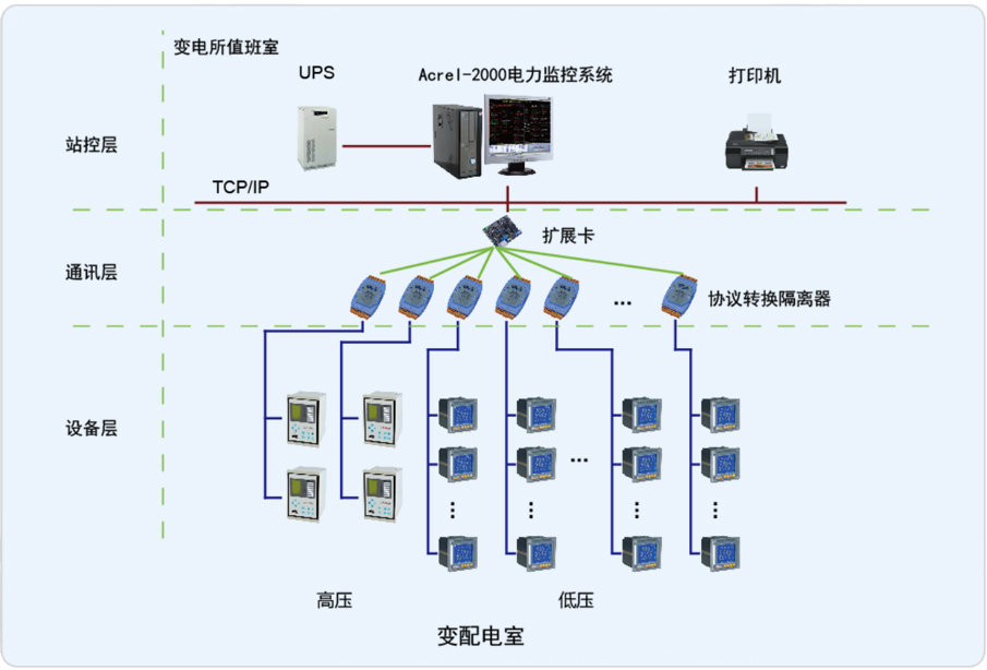 本項目承接其10KV配電增容改造變電所部分電力監(jiān)控系統(tǒng),其中有兩路高壓進線,配有綜合保護裝置,低壓部分,進線柜、饋線柜配有儀表。通過Acrel-2000電力監(jiān)控系統(tǒng),實時監(jiān)測變電所內(nèi)各個回路的電流、電壓、功率、開關(guān)狀態(tài)等電參量,由此達到變電所少人值守或無人值守的智能化管理。